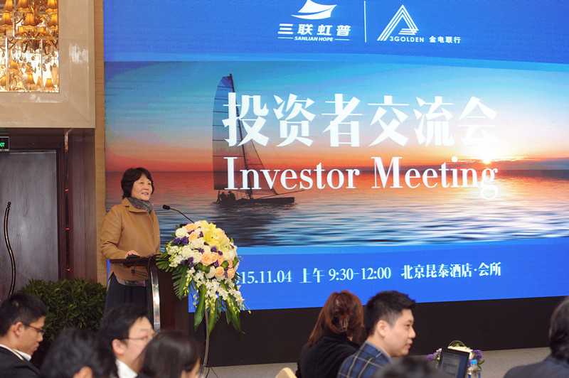 2015年11月4日,三聯虹普協同金電聯行于北京昆泰酒店成功舉辦了一場“投資者交流會”,三聯虹普董事長/總經理劉迪女士、副總經理李德和先生、董事會秘書/ 副總經理韓梅女士、三聯金電董事長張敏喆先生、金電聯行董事長范曉忻先生、首席科學家朱志偉先生、董事會秘書白雪松先生、三聯金電總經理王懿女士,出席了會議并與投資者交流,100多名基金、證券公司代表參加了會議。會議議程主要包括:三聯虹普經營情況及發展戰略演講、金電聯行業務介紹演講、一站式征信業務發布及發展前景演講、投資者問答環節等。